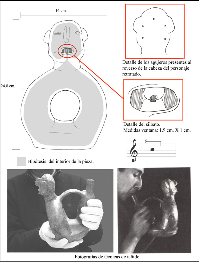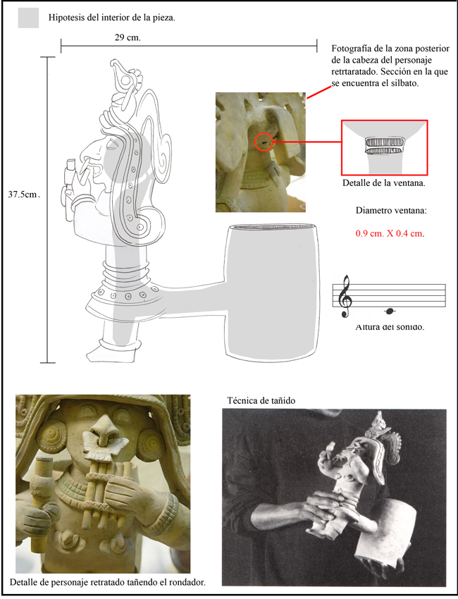 The figure portrayed in this piece is playing a rondador (four-tube panpipe) with one hand, and shaking a maraca with the other.