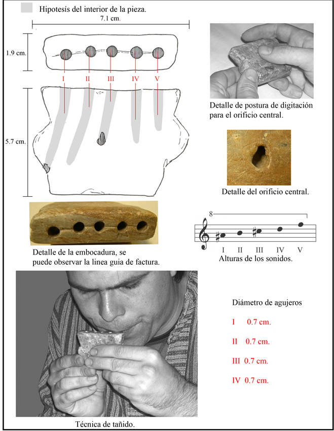 The artifact is a kind of pan pipe, with an unperforated handle on each side and five aligned closed-ended tubes. It has two holes, one of which is located in the center of the lateral surface, as is found in the “anthropomorphic pinkulwe” type flutes of the Vergel culture. The other hole is on one edge and seems to be a result of wear or, perhaps more likely, the ‘killing’ of the flute before its placement in its owner’s tomb.