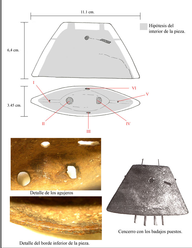 This instrument, an idiophone, is incomplete because it lacks its clappers. Normally, such bells would have had between five and ten small sticks inside –the number used depended on the intensity of movement– that made sounds when they struck the inside of the bell. This thin wooden artifact was carefully worked so as to improve the sound it produced.
