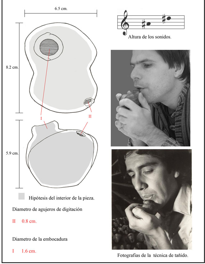 The flute was crafted in the form of a feline, using the technique of modeling with incisions and applied adornments. It may be blown through the largest hole, located on top of the figure’s head, using the other hole to change the note through fingering. This instrument can produce sounds with the pitches of A# and D#.