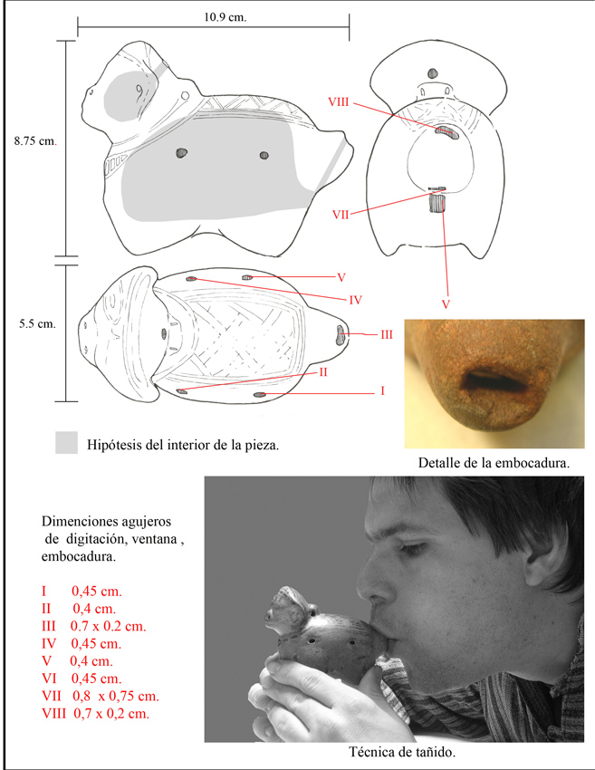 The general form is of a standing quadrupedal animal, with the forelegs bent forward. The body is decorated with lines and geometric figures; the eyes are drawn on with a dark line, and are almond-shaped with a small line in the center. There are four fingering holes on the animal’s back, which allow this instrument to make five different notes. The mouthpiece is located at the figure’s tail. Inside, an air guide sets up a vibration when the air meets a sharp edge, producing the sound. The piece allows the player to play fast melodies by changing the fingering.