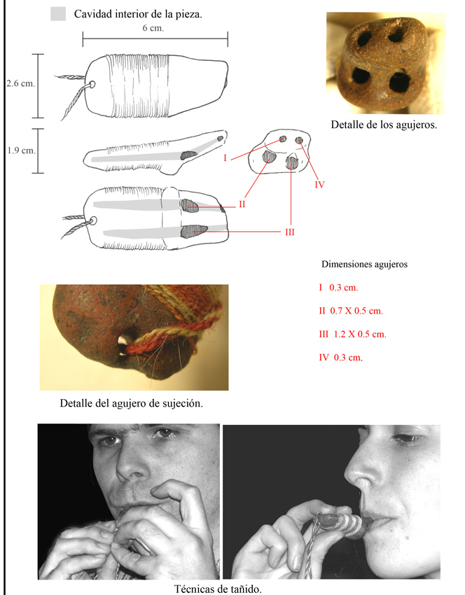 It is a double ocarina, which means that, when played, it produces two slightly out of key sounds at the same time. This generates a forceful, strident, dissonant sound with tremolos (the sound varies over time). Half of the piece is wrapped with thread, forming bands in two colors.